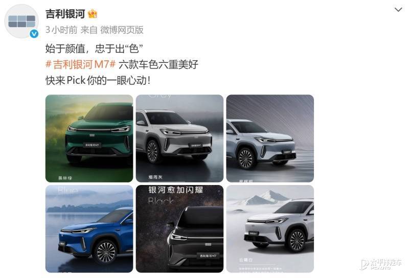 【太平洋汽车 新车频道】日前,我们从吉利银河官方获悉,旗下全新中型插电混动SUV——银河M7将于4月份正式上市。新车将提供玄夜黑、烟雨灰、晨林绿、云溪白、瀚宇蓝、星辉银共计六款车身配色,以满足不同消费者的个性化需求。