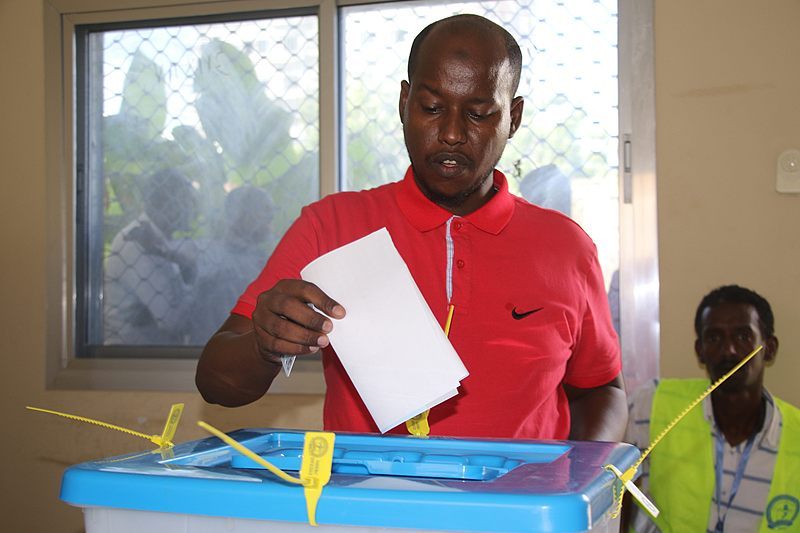 △索马里首都摩加迪沙,一名市民在地方选举投票站投票