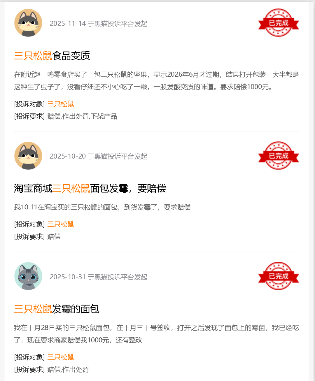 在黑猫投诉 【下载黑猫投诉客户端】平台,三只松鼠的投诉词条近5000条,不少消费者都反映食品有异物、发霉等问题。